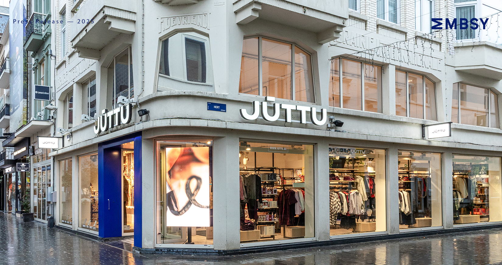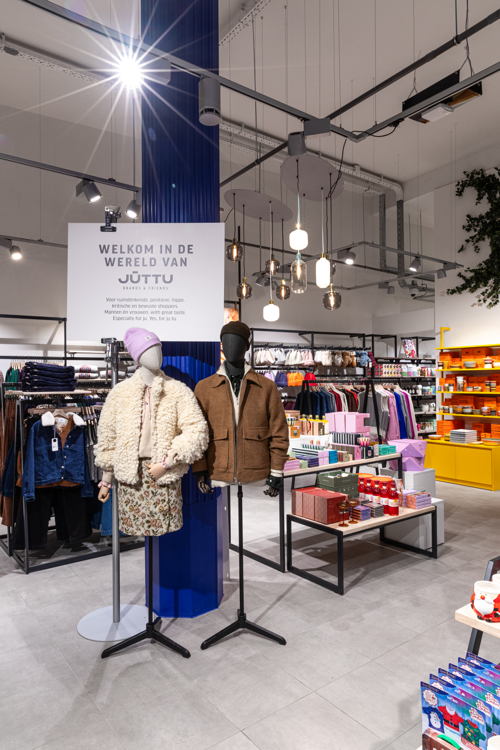 De buitenkant van het gloednieuwe Juttu-pand speelt speels in op de omgeving, met een bestickering die subtiel verwijst naar ijsbar Gelato Maxzim aan de overkant. En een kleine tip: mocht je daar een ijsje morsen, dan is een gloednieuwe outfit nooit ver weg ;).
