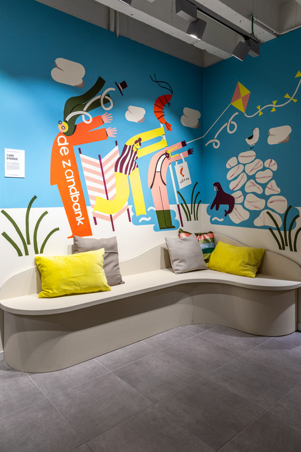 Wie even wil uitrusten, kan neerstrijken in de zithoek toepasselijk genaamd “De Zandbank”. Deze werd ontworpen door illustrator en interieurdesigner Caro D’hooge, die lange tijd Oostende haar thuis mocht noemen. Boven de bank prijkt een beschildering die verwijst naar de badstad, waarin subtiel ook de totebag te zien is die tijdens het openingsweekend aan bezoekers wordt weggegeven.